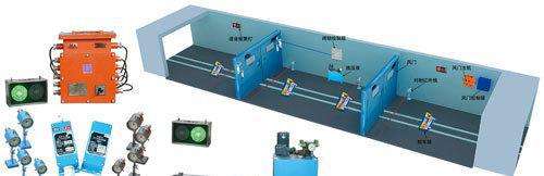 风门的开启关闭通过钢丝绳传递给对面风门的插销装置,阻止对面风门的开启。该联锁价格低廉,根据需要还可以增加语音报警。由于风门的“开启、关闭”信息是通过钢丝绳传递,所以两风门之间的距离不能过大,一般20m左右。