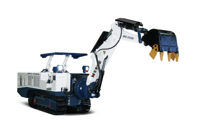 该机工作大臂可以左右摆动45°,大臂也可以旋转360°,同时配有前推铲,可以满足上顶板挖掘,侧邦挖掘和下部挖掘、破岩、装车、起吊等各项动作要求,实现挖掘毛水沟、卧底、破岩、清理浮煤、清理皮带机底部、平整巷道及小型配件吊装等多种功能作业,并具有体积小,机动灵活、安全高效等特点。